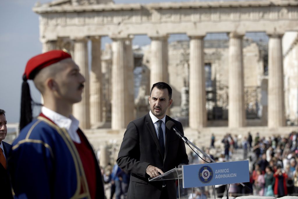Ο υπουργός Εσωτερικών, Αλέξης Χαρίτσης, εκπροσωπώντας την κυβέρνηση, απευθύνει χαιρετισμό κατά την διάρκεια της έπαρσης της σημαίας στον Ιερό Βράχο της Ακρόπολης στο πλαίσιο των εκδηλώσεων για την απελευθέρωση της Αθήνας, Παρασκευή 12 Οκτωβρίου 2018. ΑΠΕ-ΜΠΕ /ΑΠΕ-ΜΠΕ/ΓΙΑΝΝΗΣ ΚΟΛΕΣΙΔΗΣ