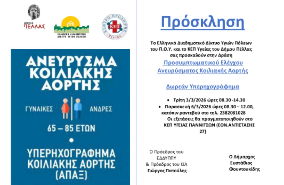 Το ΚΕΠ Υγείας Δήμου Πέλλας και η Αντιδημαρχία Κοινωνικής Πολιτικής και Ισότητας σε συνεργασία με το Ελληνικό Διαδημοτικό Δίκτυο Υγιών Πόλεων (ΕΔΔΥΠΠΥ), και με τη συμβολή του Γενικού Νοσοκομείου Γιαννιτσών, διοργανώνουν δράση προληπτικού ελέγχου για το Ανεύρυσμα Κοιλιακής Αορτής την Τρίτη 3 Μαρτίου 2026 από τις 8:30π.μ έως τις 2:30μ.μ και την Παρασκευή 6 Μαρτίου 2026 από τις 8:30π.μ έως τις 12μ.μ.