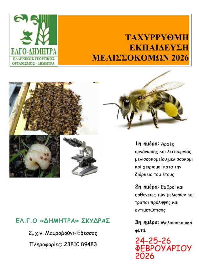 Ο ΕΛΓΟ – ΔΗΜΗΤΡΑ Σκύδρας πρόκειται να ξεκινήσει την υλοποίηση ενός ταχύρρυθμου προγράμματος που απευθύνεται σε Μελισσοκόμους της Π.Ε.Πέλλας. Η κατάρτιση των μελισσοκόμων θα ξεκινήσει στις 24-02-2026 ημέρα Τρίτη και ώρα 15:00.