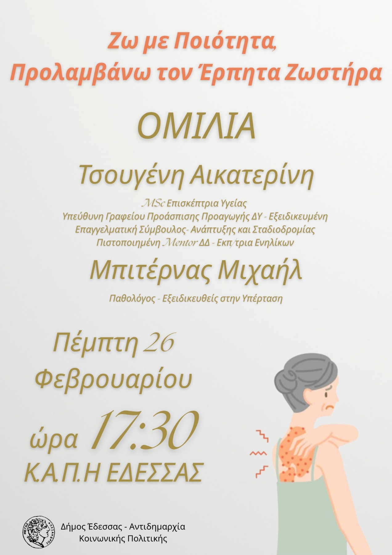 «Ζω με Ποιότητα, Προλαμβάνω τον Έρπητα Ζωστήρα», την Πέμπτη 26 Φεβρουαρίου και ώρα 17:30, στον χώρο του ΚΑΠΗ Έδεσσας.