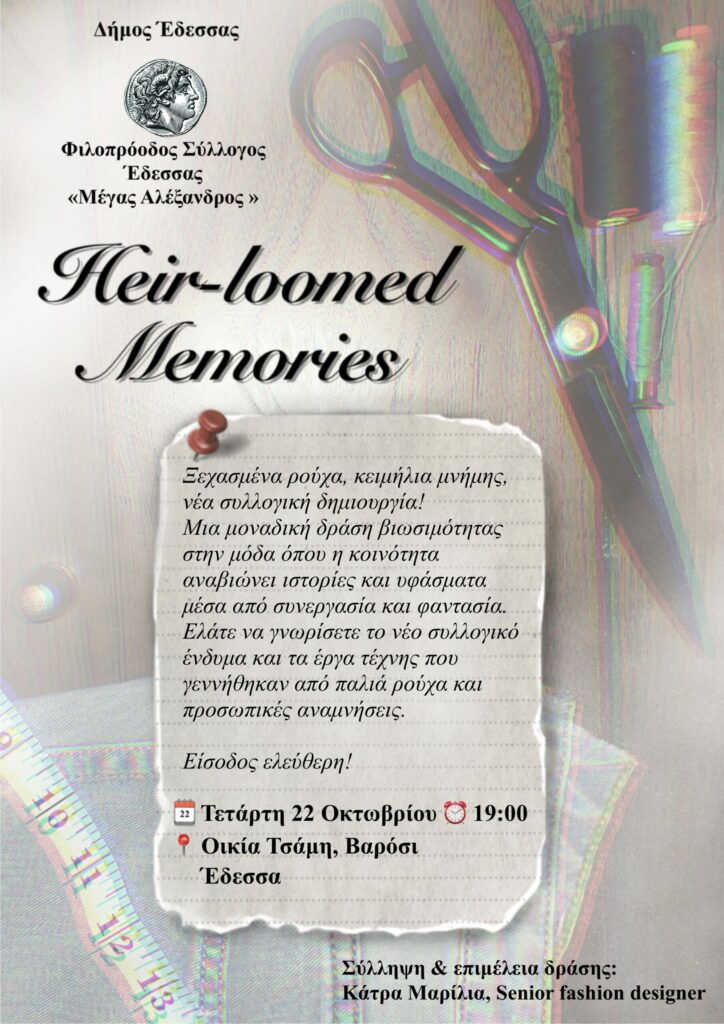 Ο Φιλοπρόοδος Σύλλογος Έδεσσας «Μέγας Αλέξανδρος» διοργανώνει την Τετάρτη 22 Οκτωβρίου 2025 και ώρα 19:00, στην οικία Τσάμη (Βαρόσι) στην Έδεσσα, την παρουσίαση της συμμετοχικής δράσης Heir-loomed Memories, με επιμέλεια και συντονισμό της Μαρίλιας Κάτρα, Senior Fashion Designer.Η δράση, που εντάσσεται στο πλαίσιο της πτυχιακής εργασίας της Μαρίλιας Κάτρα με θέμα «Η βιωσιμότητα στις τάσεις της μόδας», υλοποιήθηκε ως εργαστήριο δημιουργικής ανακύκλωσης ενδυμάτων με τη συμμετοχή μελών του Συλλόγου, στο Υπόγειο Τέχνης. Παλιά ρούχα και προσωπικές ιστορίες ενώθηκαν για να δημιουργήσουν ένα νέο συλλογικό ένδυμα και καλλιτεχνικά έργα, αναδεικνύοντας τη δύναμη της κοινότητας και της βιώσιμης δημιουργίας.Η είσοδος είναι ελεύθερη. Με την υποστήριξη του Δήμου Έδεσσας. Πληροφορίες:Οικία Τσάμη, Βαρόσι, Έδεσσα Τετάρτη 22 Οκτωβρίου 2025 Ώρα: 19:00