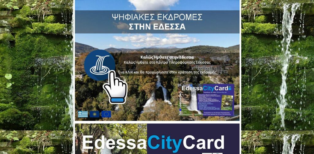 Η εμπειρία της Έδεσσας ολοκληρώνεται μέσα από περιπάτους στη φύση, τοπικές γεύσεις και αυθεντικές στιγμές που συνδέουν τον επισκέπτη με τον τόπο. Η Edessa City Card λειτουργεί ως ένα σύγχρονο εργαλείο γνωριμίας με την πόλη, προσφέροντας οργανωμένη πρόσβαση και προνόμια που αναδεικνύουν τον φυσικό και πολιτιστικό της πλούτο. Μπορείτε να την προμηθευτείτε από το Κέντρο Τουριστικής Πληροφόρησης στο πάρκο Καταρρακτών 365 ημέρες τον χρόνο!