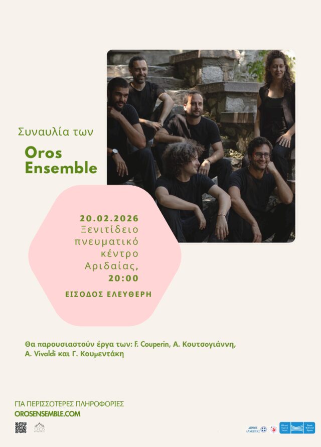 Άλλη μια δυνατή καλλιτεχνική σύμπραξη στο Δήμος Αλμωπίας σε συνεργασία με την Εθνική Λυρική Σκηνή -ΕΛΣ-. Το μουσικό σύνολο “Oros Ensemble” ταξιδεύει στην Αριδαία  για να παρουσιάσει ένα ξεχωριστό μουσικό πρόγραμμα με επίτιμο προσκεκλημένο τον συνθέτη και καλλιτεχνικό διευθυντή της ΕΛΣ Γιώργο Κουμεντάκη.