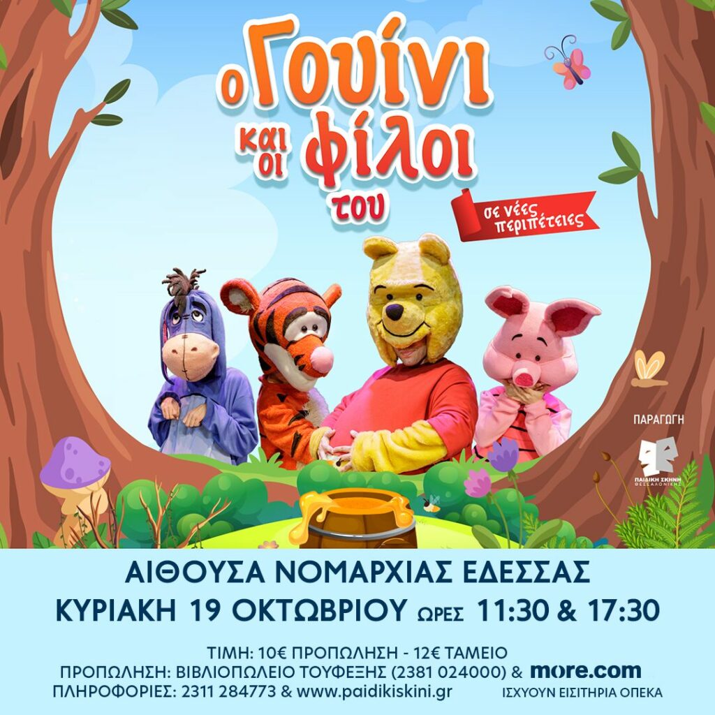 Το αγαπημένο αρκουδάκι των παιδιών και η παρέα του ζωντανεύουν στη σκηνή μέσα από τη νέα παραγωγή της Παιδικής Σκηνής Θεσσαλονίκης, «Ο Γουίνι και οι φίλοι του σε νέες περιπέτειες!», μια παράσταση γεμάτη χιούμορ, μουσική, φαντασία και μπόλικη…τιγροσύνη, που αναδεικνύει τη σημασία του να πιστεύεις στον εαυτό σου, να σηκώνεσαι κάθε φορά που πέφτεις και να μη χάνεις ποτέ μα ποτέ τη χαρά του παιχνιδιού! Έρχεται στην Αίθουσα Νομαρχίας Έδεσσας, στις 19 Οκτωβρίου στις 11:30 και στις 17:30 και στο Πνευματικό Κέντρο Γιαννιτσών, στις 26 Οκτωβρίου στις 18:00.