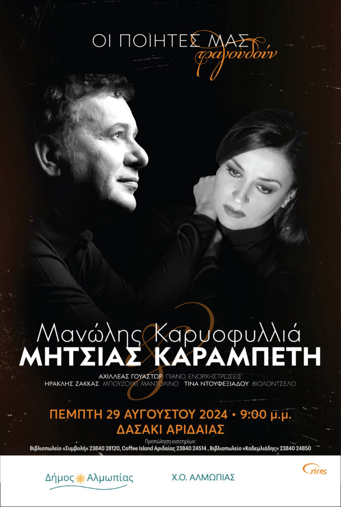 Μετά τις επιτυχημένες soldout συναυλίες, ο Μανώλης Μητσιάς και η Καρυοφυλλιά Καραμπέτη περιδιαβαίνουν τον μαγικό κόσμο της ελληνικής ποίησης παρουσιάζοντας αυτή τη φορά στο θέατρο Δασάκι της Αριδαίας ένα πρόγραμμα που περιλαμβάνει έργα σπουδαίων Ελλήνων ποιητών και στιχουργών, που έχουν μελοποιήσει οι συνθέτες Μίκης Θεοδωράκης, Μάνος Χατζιδάκις, Σταύρος Ξαρχάκος, Δήμος Μούτσης, Ηλίας Ανδριόπουλος, Θάνος Μικρούτσικος, Χρήστος Λεοντής, και Γιάννης Σπανός.