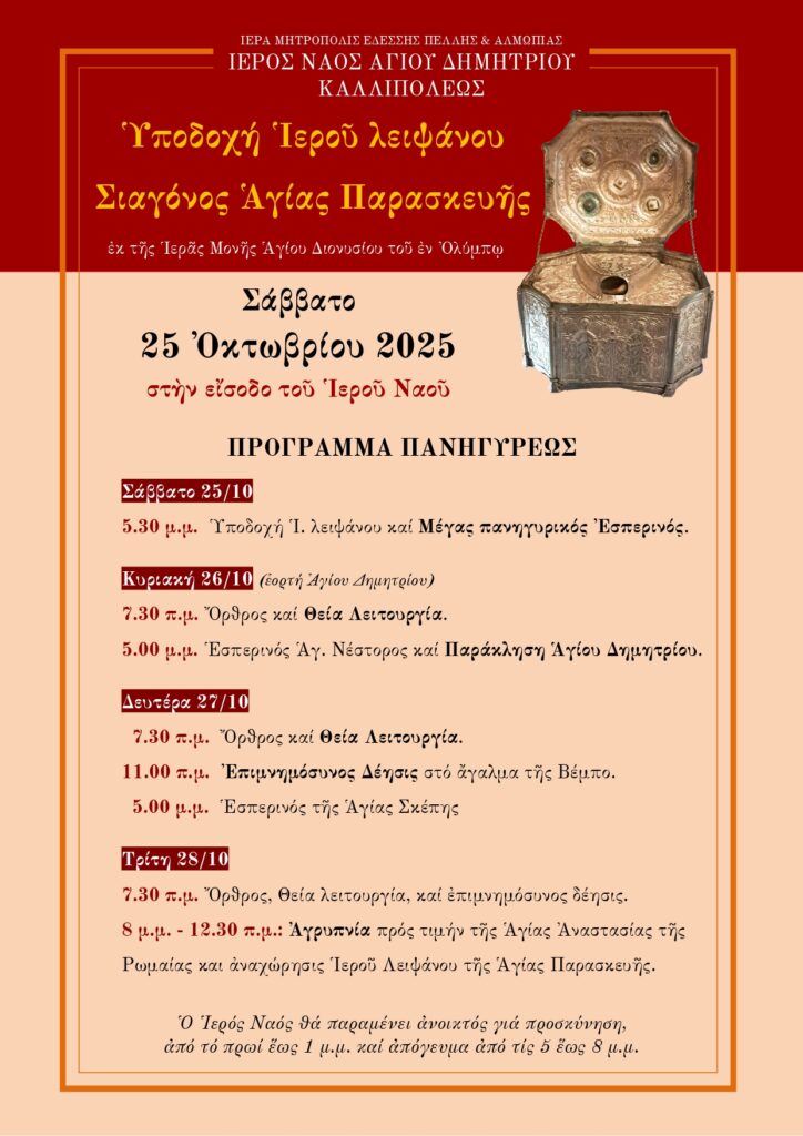 Την Κυριακή 26 Οκτωβρίου πανηγυρίζει ο Ιερός Ναός Αγίου Δημητρίου στην Καλλίπολη Σκύδρας σύμφωνα με το παρακάτω πρόγραμμα.