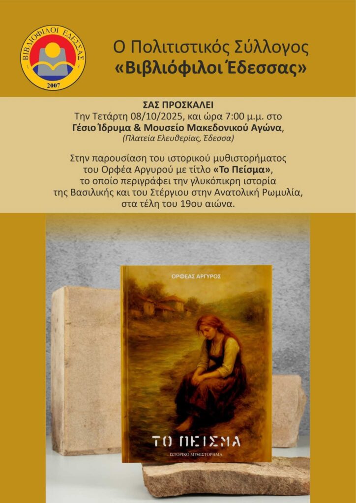 Μια ξεχωριστή λογοτεχνική βραδιά διοργανώνουν οι «Βιβλιόφιλοι Έδεσσας» την Τρίτη 8 Οκτωβρίου 2025, στις 19:00, στην αίθουσα εκδηλώσεων του Μουσείου Γέσιου (2ος όροφος). Το κοινό θα έχει την ευκαιρία να γνωρίσει από κοντά το νέο βιβλίο του Ορφέα Αργυρού, με τίτλο «ΤΟ ΠΕΙΣΜΑ», ένα έργο που βασίζεται σε αληθινή ιστορία αγάπης, πείσματος και ιστορικών ανατροπών.