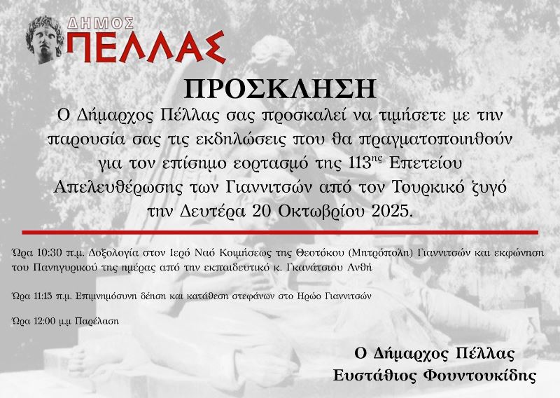 Οι εορταστικές εκδηλώσεις της 113ης Επετείου της Απελευθέρωσης των Γιαννιτσών από τον τουρκικό ζυγό έχουν ως εξής:
