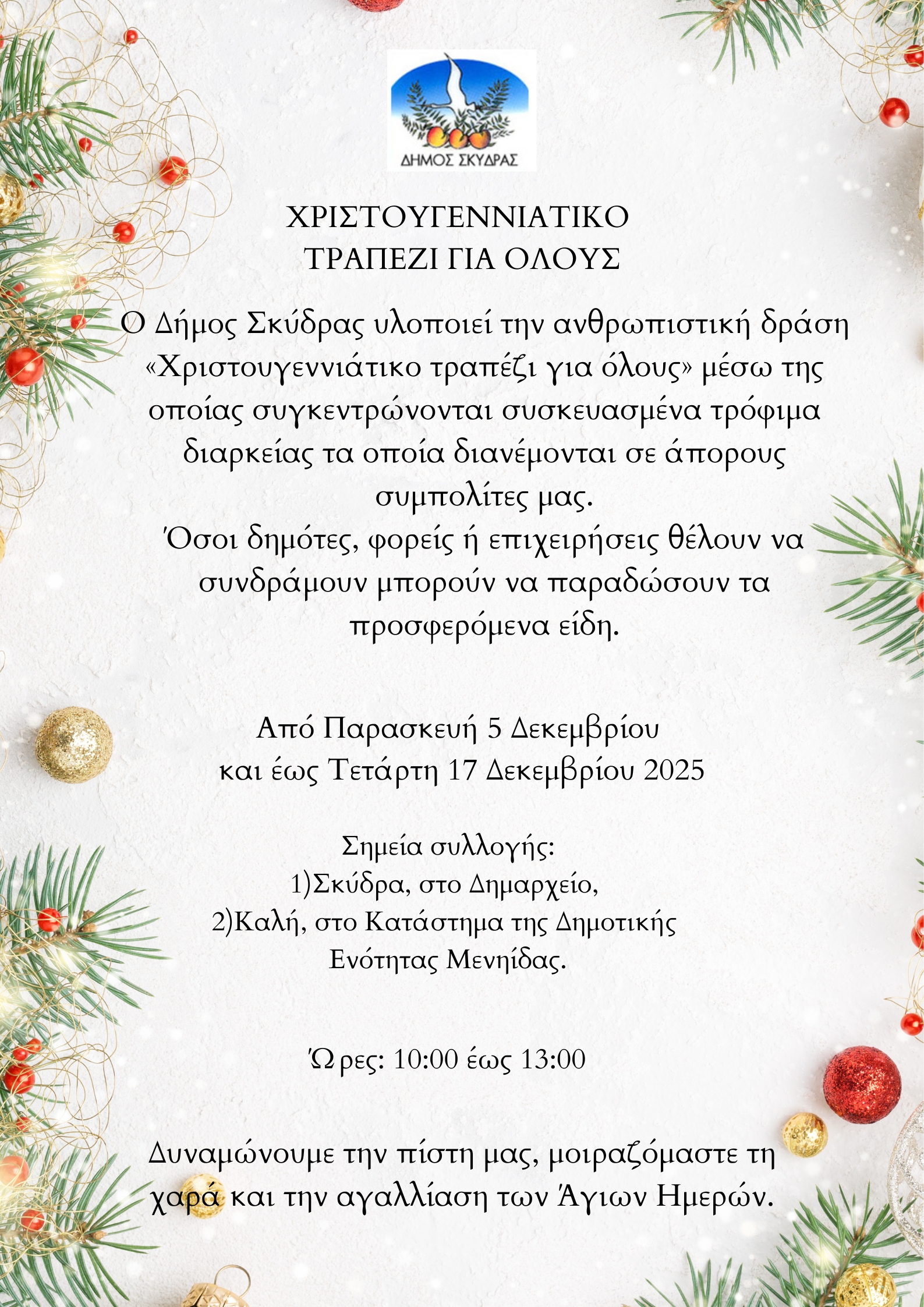 Ο Δήμος Σκύδρας σταθερά προσηλωμένος στην υποστήριξη και στην ενίσχυση των ευάλωτων συνανθρώπων μας υλοποιεί και φέτος την κοινωνική δράση «Χριστουγεννιάτικο τραπέζι για όλους».