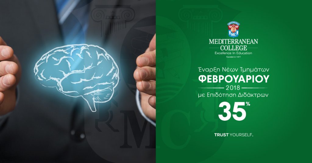 Ξεκίνα τις σπουδές σου ΑΜΕΣΑ στο Mediterranean College, με την έναρξη των νέων τμημάτων Φεβρουαρίου με ΕΠΙΔΟΤΗΣΗ ΔΙΔΑΚΤΡΩΝ 35%, σε Προπτυχιακά και Μεταπτυχιακά προγράμματα που προσφέρει το 1ο Ιδιωτικό Αγγλόφωνο Κολλέγιο στην Ελλάδα.