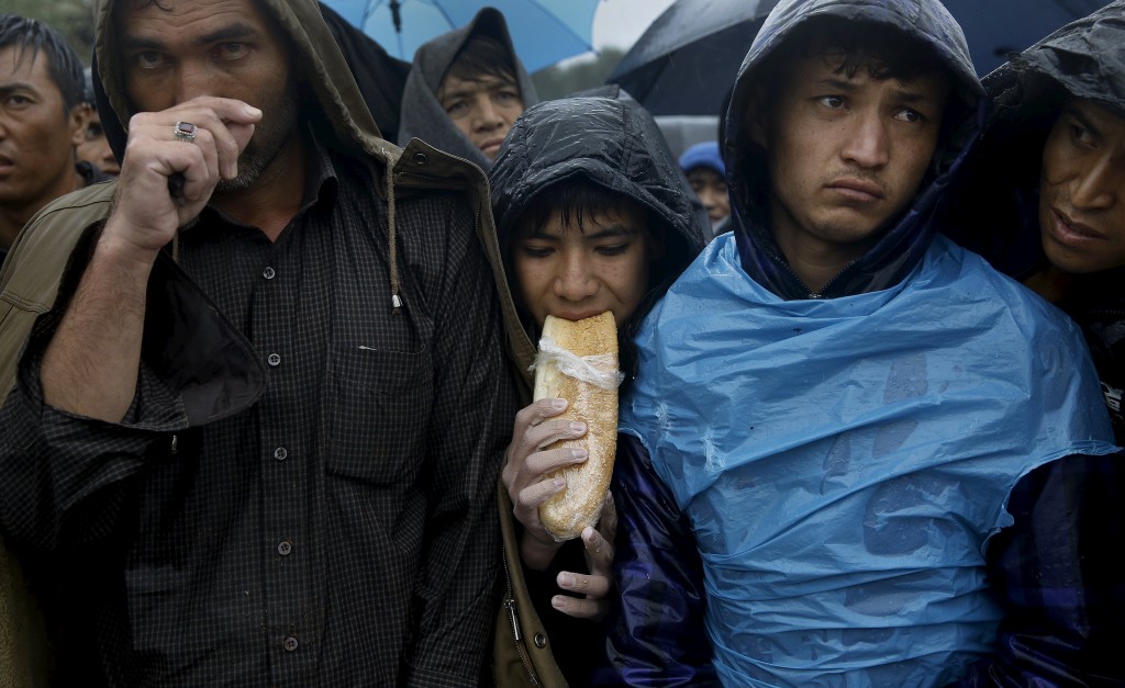 Afghan migrants line-up while waiting to be registered at a camp during a rainstorm on the Greek island of Lesbos October 23, 2015. Over half a million refugees and migrants have arrived by sea in Greece this year and the rate of arrivals is rising, in a rush to beat the onset of freezing winter, the United Nations said. REUTERS/Yannis Behrakis