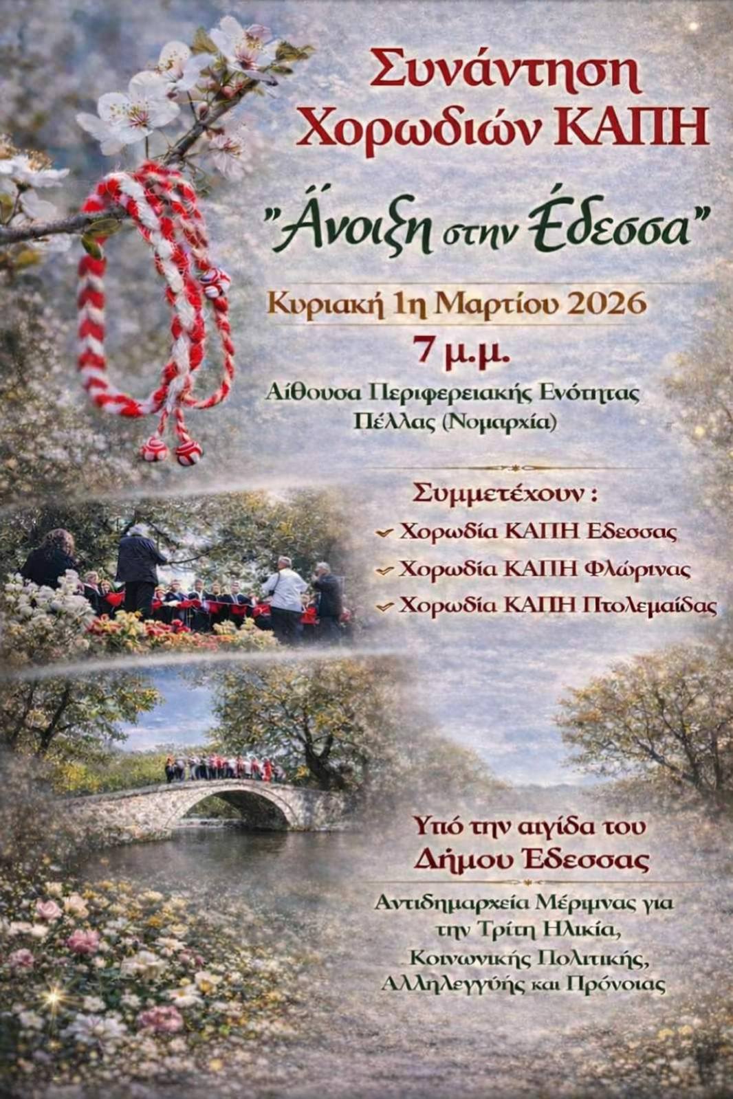 Ο Δήμος Έδεσσας και η Αντιδημαρχία Μέριμνας για την Τρίτη Ηλικία, Κοινωνικής Πολιτικής, Αλληλεγγύης και Πρόνοιας σας προσκαλούν στη «Συνάντηση Χορωδιών ΚΑΠΗ – Άνοιξη στην Έδεσσα», μια ξεχωριστή μουσική εκδήλωση αφιερωμένη στη χαρά της συμμετοχής, της δημιουργίας και της ανθρώπινης επικοινωνίας.