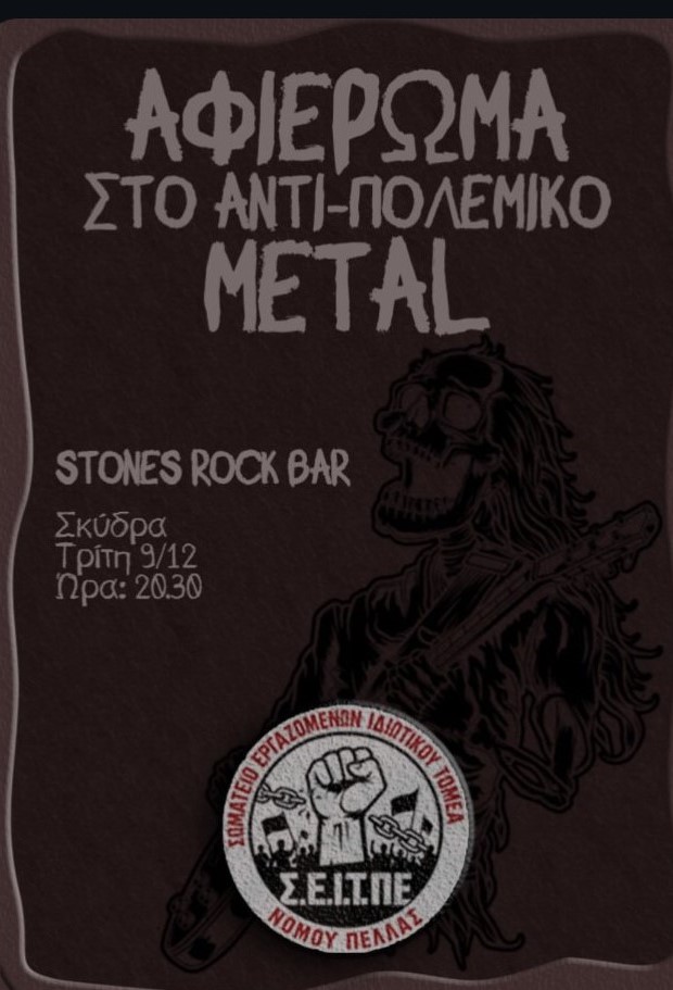 Το Σωματείο μας αφιερώνει τη βραδιά της Τρίτης 9 Δεκέμβρη στο αντιπολεμικό και πολιτικο metal, ένα είδος που εδώ και δεκαετίες δίνει παλμό στους αγώνες, υψώνει τη φωνή απέναντι στην αδικία και σπάει τη σιωπή που επιβάλλουν τα κέρδη των λίγων.