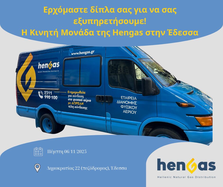 Την Πέμπτη 6 Νοεμβρίου 2025, από τις 10:00 έως τις 16:00, το ενημερωτικό βανάκι της Hengas θα βρίσκεται στην οδό Δημοκρατίας 22 (πεζόδρομος) στην Έδεσσα. Στόχος της δράσης είναι η ενημέρωση των κατοίκων για το φυσικό αέριο, που πλέον είναι διαθέσιμο στην πόλη, καθώς και για τους τρόπους επικοινωνίας και τη διαδικασία σύνδεσης με το δίκτυο διανομής. Στον χώρο θα βρίσκεται προσωπικό της εταιρείας, το οποίο θα παρέχει αναλυτικές πληροφορίες σχετικά με τα βήματα που απαιτούνται μέχρι την τροφοδοσία των κατοικιών και επαγγελματικών χώρων με φυσικό αέριο. Παράλληλα, θα διανέμεται ενημερωτικό υλικό και αναμνηστικά δώρα στους επισκέπτες.
