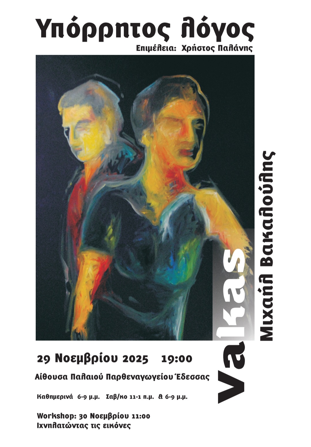Εγκαινιάζεται το Σάββατο 29 Νοεμβρίου 2025, στις 7:00 μ.μ., στην Αίθουσα του Παλαιού Παρθεναγωγείου Έδεσσας η νέα ατομική έκθεση του Λαρισαίου εικαστικού Μιχαήλ Βακαλούλη (Vakas), σε επιμέλεια του εικαστικού Χρήστου Παλάνη. Η νέα δουλειά του καλλιτέχνη φέρει τον τίτλο «Υπόρρητος λόγος» και αποτελείται από έργα που φιλοτεχνήθηκαν την τελευταία διετία. Η Ιστορικός Τέχνης – Αρχαιολόγος Ελένη Παπανικολάου σημειώνει πως ο «Υπόρρητος λόγος» δεν μετριέται· υπονοείται, διαχέεται, εγγράφεται στις μορφές και στα σώματα.